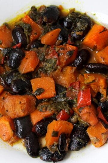 Μαύρα φασόλια γίγαντες με κολοκύθα, ξινόμαυρο και αρωματικά. Black beans with pumpkin, xinomavro wine and aromatics.