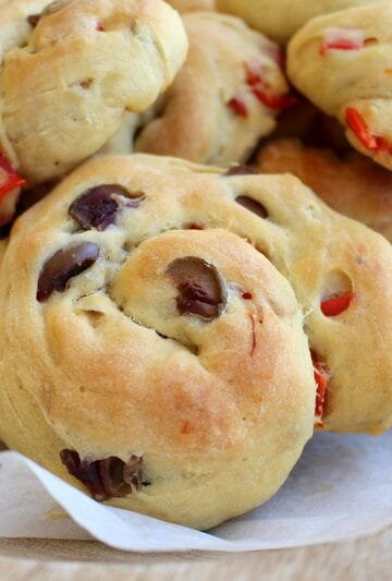 Ελαιοψωμάκια λίγο πιο γιορτινά με πιπεριά και κολοκυθόσπορους. Little olive breads with red pepper and pumpkin seeds for a festive breakfast.