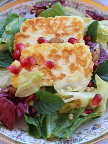 Σαλάτα με χαλούμι, ρόδι, φρέσκια μέντα και πλιγούρι. Salad with haloumi, pomegranate, fresh mint leaves and bulgur.